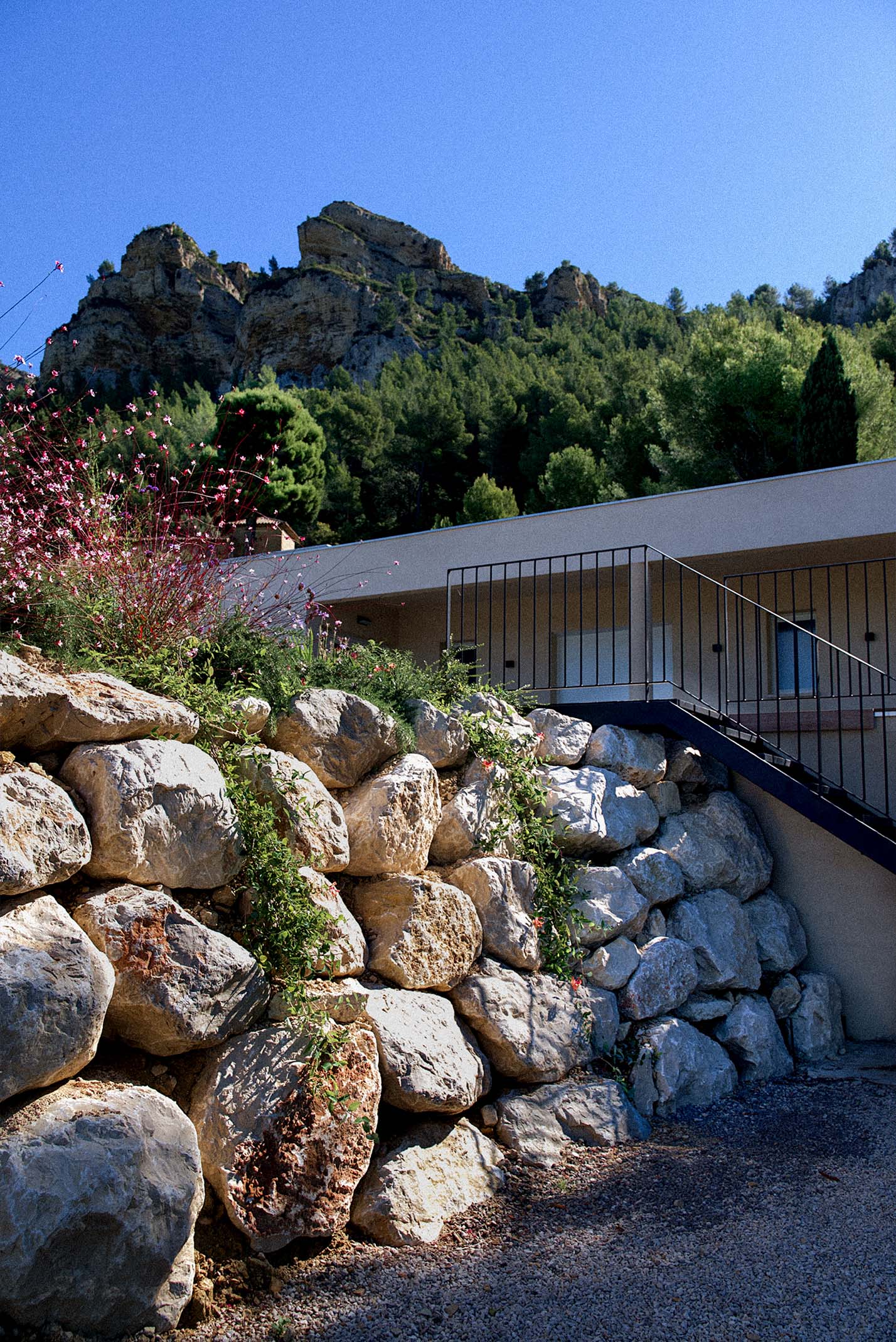 Conception sur plan du projet pour la création d’un jardin sur enrochement et en talus, engazonnement, maçonnerie paysagère, terrain de pétanque, plantations et arrosage.